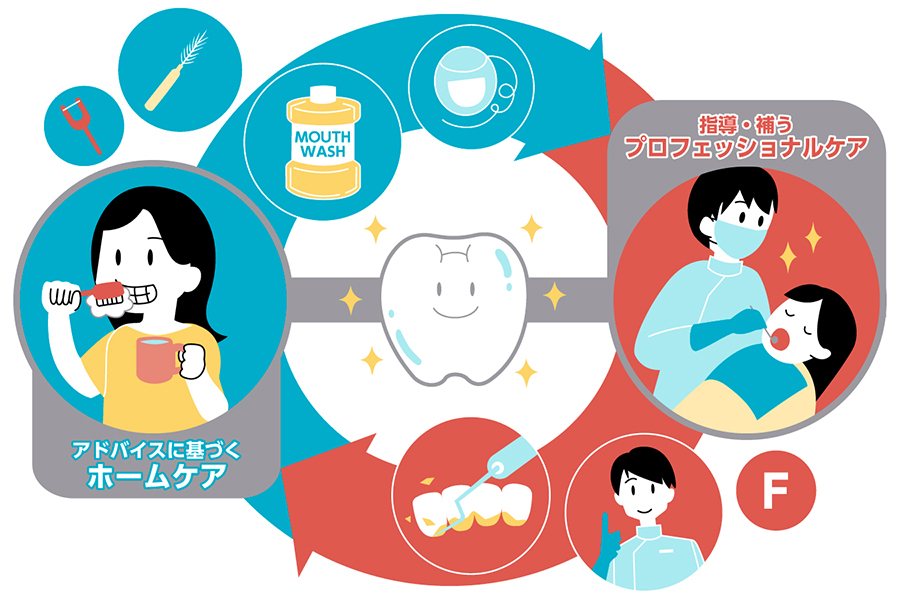その他にも歯科医院では歯科衛生士などから正しいブラッシングの指導も受けられます。我流で歯みがきをしている人は実に多く、専門家から指導してもらうことは、歯や歯ぐきを守るための大切な機会です。専門家の指導をホームケアに活かし、ホームケアだけでは行き届かない部分を専門家が補う――この両輪を回していくことが、健康なお口を保つために重要です。
